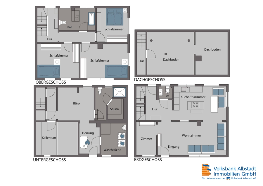 Im Untergeschoss ist neben den Nutzräumen, sowie dem Heizungs- und Öllagerraum, eine Sauna.