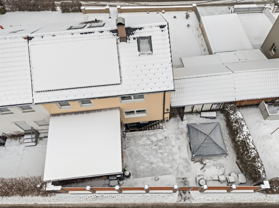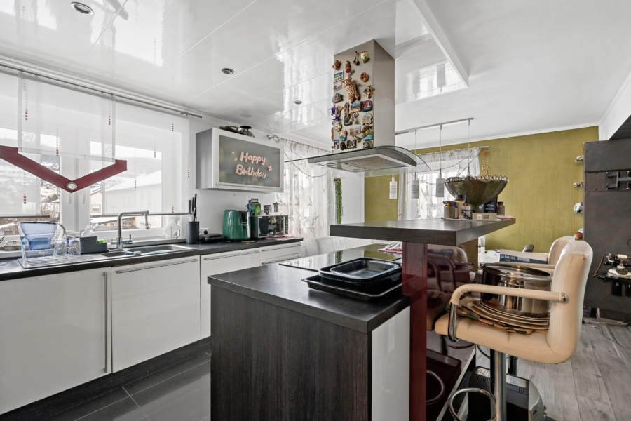 Im Erdgeschoss befindet sich die moderne Küche mit Kochinsel. Über das angrenzende Wohnzimmer gelangen Sie direkt in den Garten mit überdachtem Terrassenbereich. Ein Gäste-WC, sowie ein weiteres Zimmer sind ebenfalls vorhanden.
