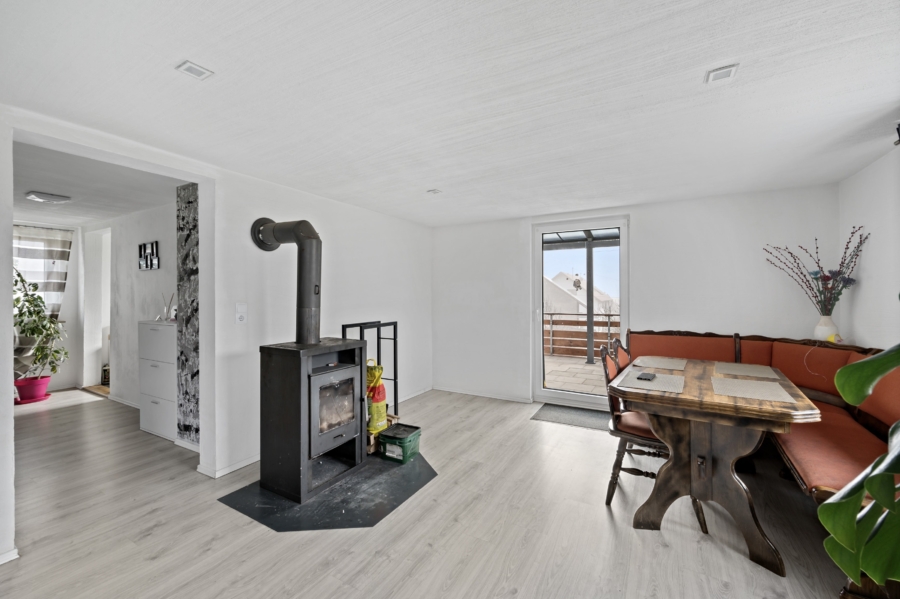 Im 1. Stock finden Sie einen geräumigen Wohn-Essbereich mit Zugang zum Balkon, die Küche, sowie ein Schlafzimmer.