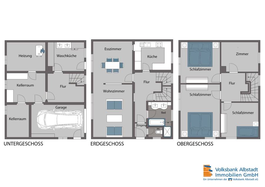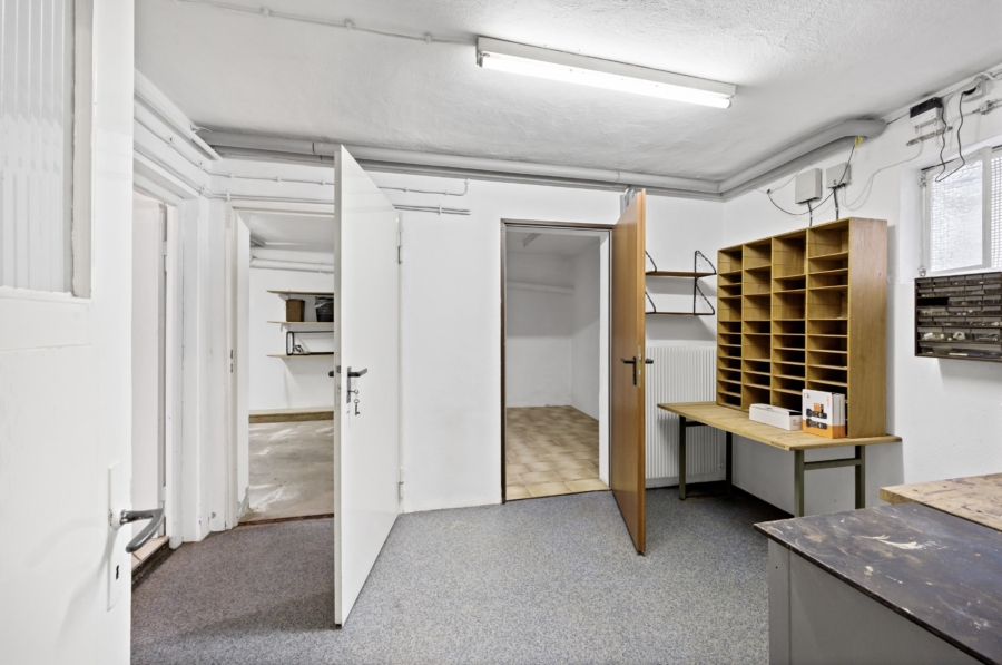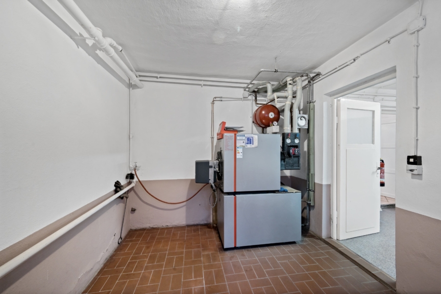 Diverse Nutzräume sowie eine Garage wurden im Untergeschoss untergebracht. Die Öltanks wurden bereits in einen Anbau außerhalb des Gebäudes verlegt.