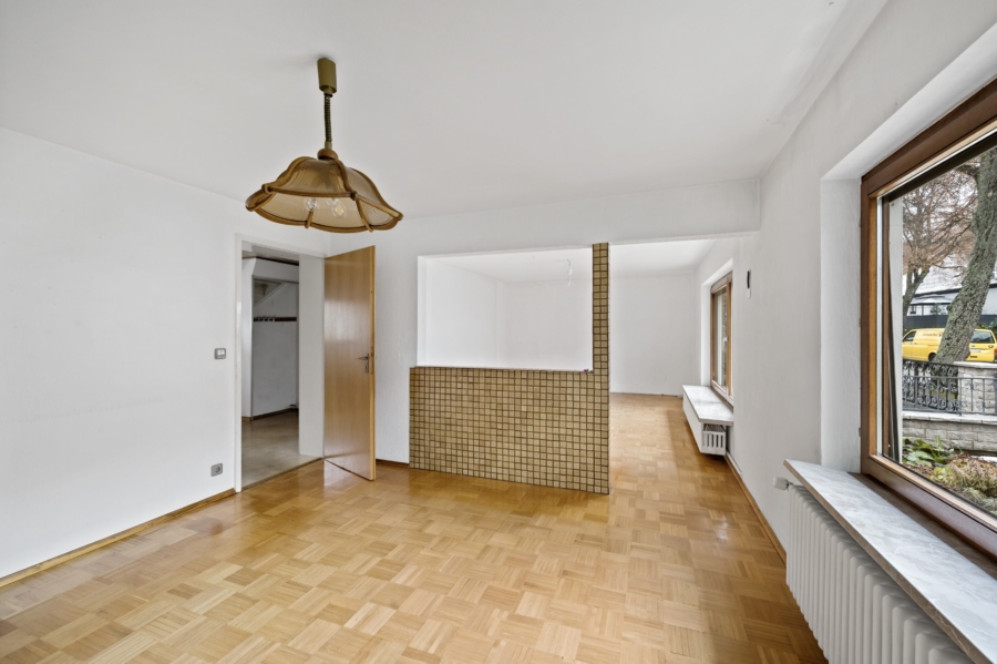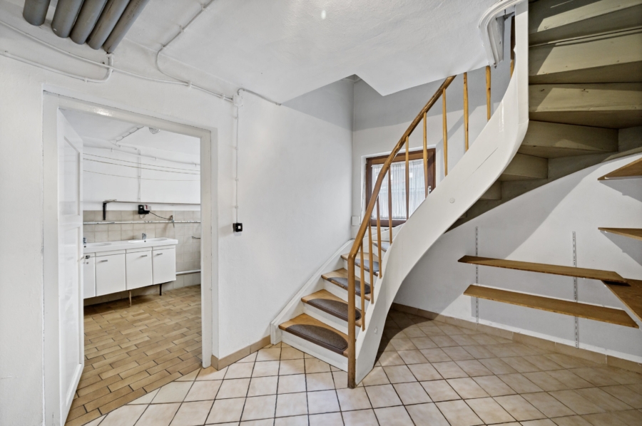 Das Erdgeschoss verfügt, dank gekonnter Aufteilung, über einen großzügigen und offenen Wohn- und Essbereich, eine Küche, ein Badezimmer mit Dusche und Badewanne sowie ein separates WC.