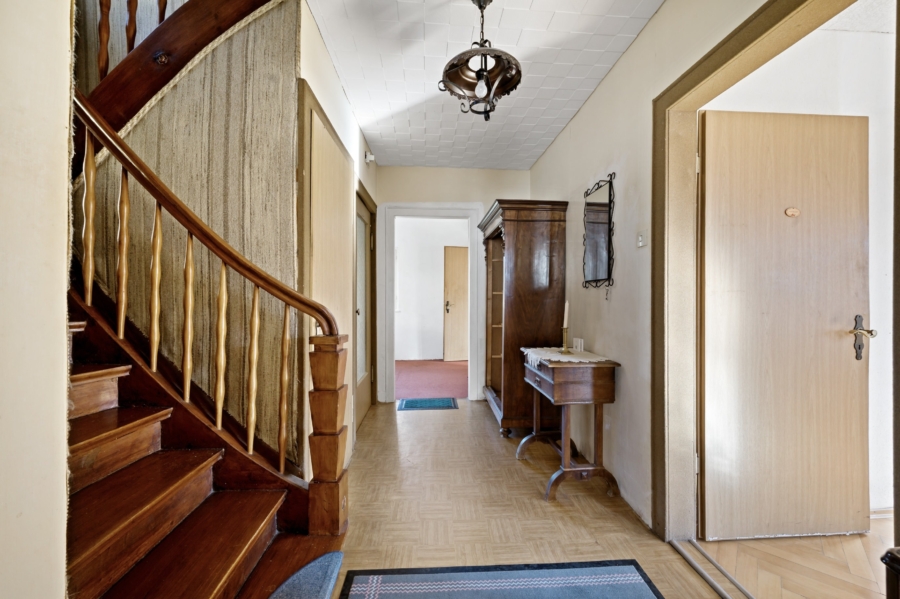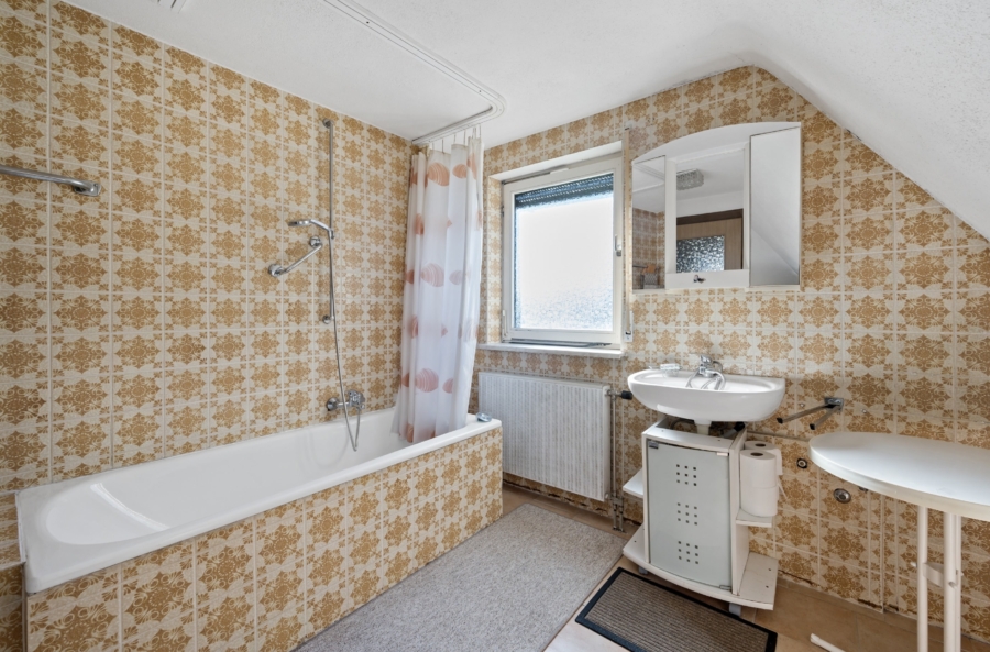 Hinweis: Das Dachfenster im Gäste-WC ist defekt. Dadurch kam es zu einem Wasserschaden, der ich im betroffenen WC sowie in der darunterliegenden Küche zeigt. Ein Teil der Wände im Untergeschoss weisen Spuren von Feuchtigkeit auf.