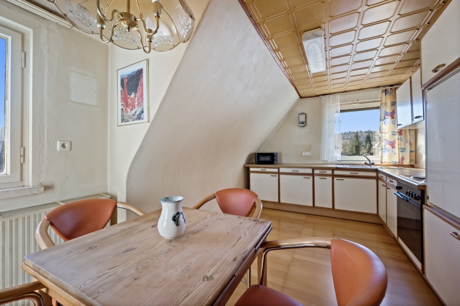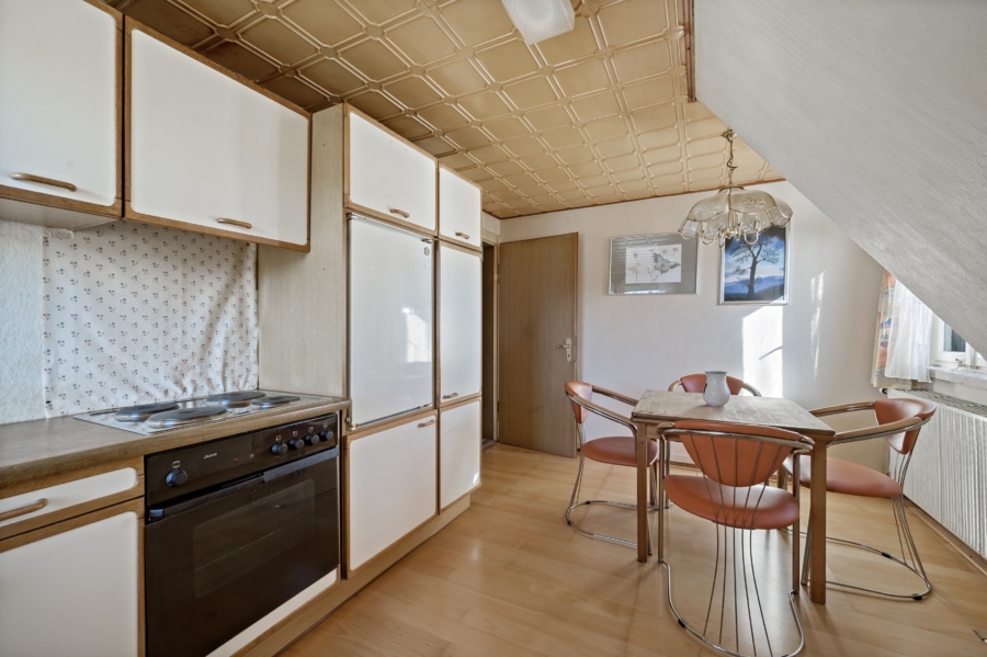 Im Dachgeschoss befinden sich 2 weitere Zimmer, eine Küche, das Badezimmer und ein Gäste-WC.
