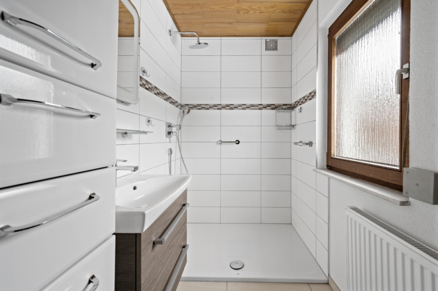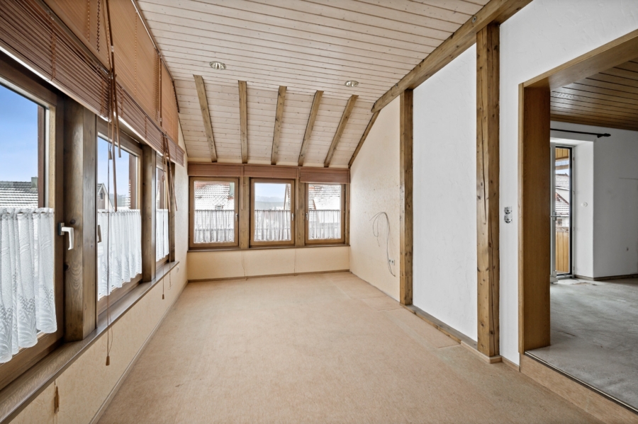 Im Erdgeschoss ist ein Bad, welches bereits mit einer bodenebenen Dusche ausgestattet ist, die separate Küche, ein Esszimmer mit Zugang zum geschlossenen Balkon, das Wohnzimmer (Wintergarten), ein WC und ein Büro sowie Flurflächen.