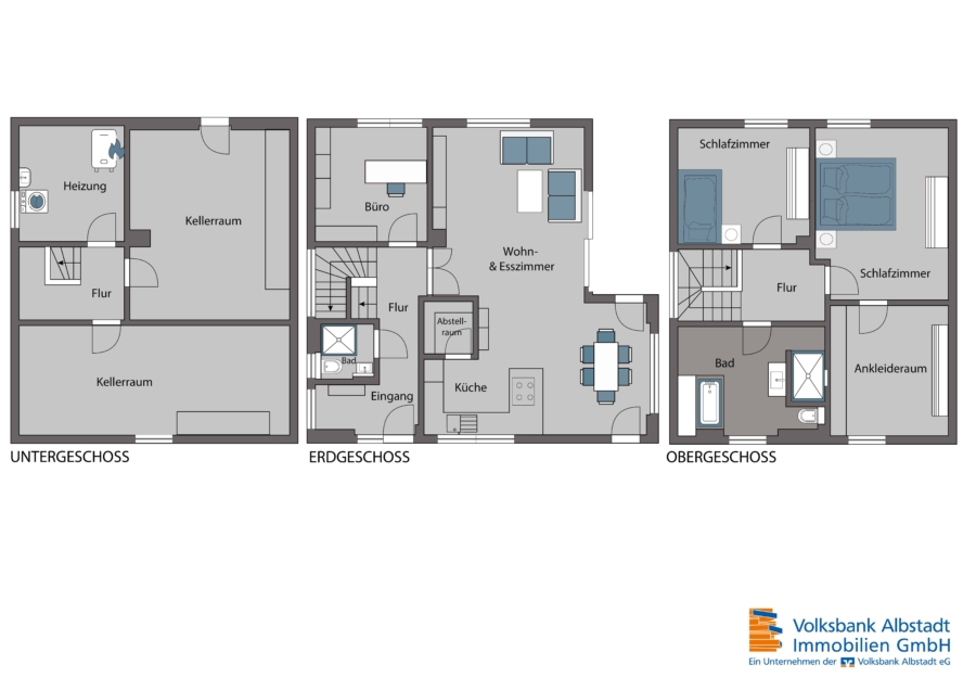 Im Kellergeschoss finden Sie zwei praktische Kellerräume, welche viel Stauraum bieten. Ein Heiz-und Technikraum, in dem die Waschmaschine, der Trockner sowie die moderne Haustechnik platz findet.