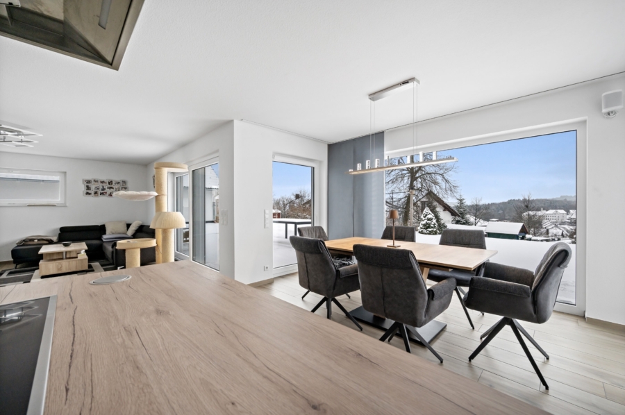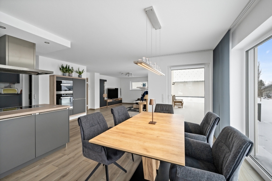 Der Wohn- und Essbereich ist großzügig und hell gestaltet. Eine offene Küche mit angrenzendem Abstellraum vollendet diesen wunderschön gestalteten Bereich.