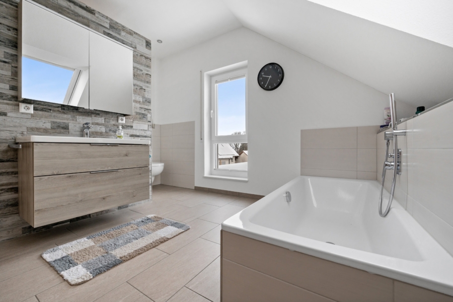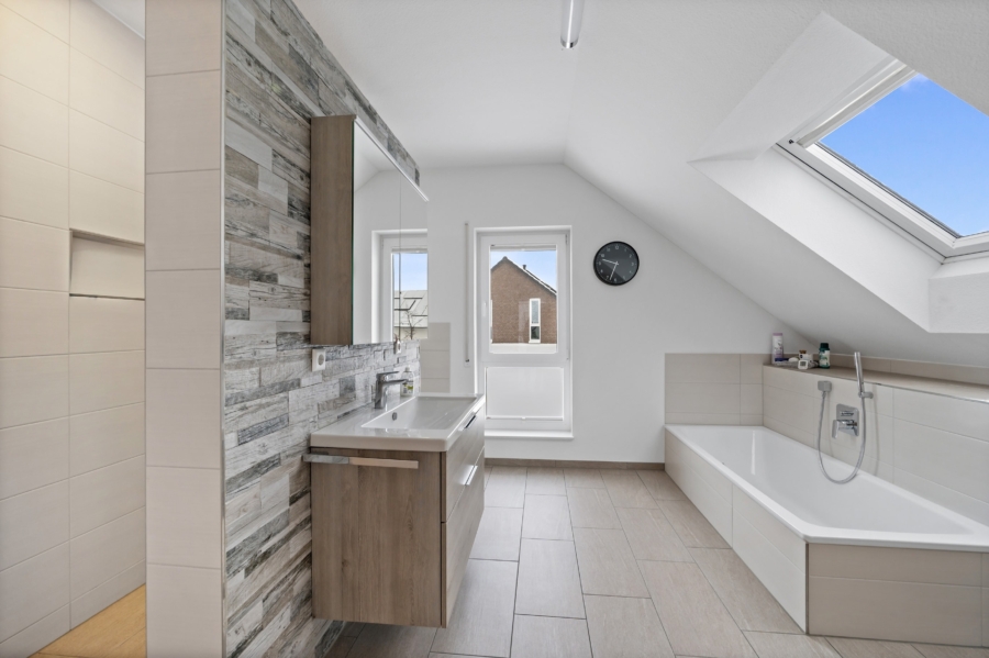 Das moderne und sehr geräumige Bad ist mit einer großen, begehbaren Dusche, einer Badewanne, einem Waschbecken und einem WC ausgestattet. Auf Grund der zur Verfügung stehenden Fläche und der modernen sowie zeitlosen Ausstattung bleiben keine Wünsche offen.