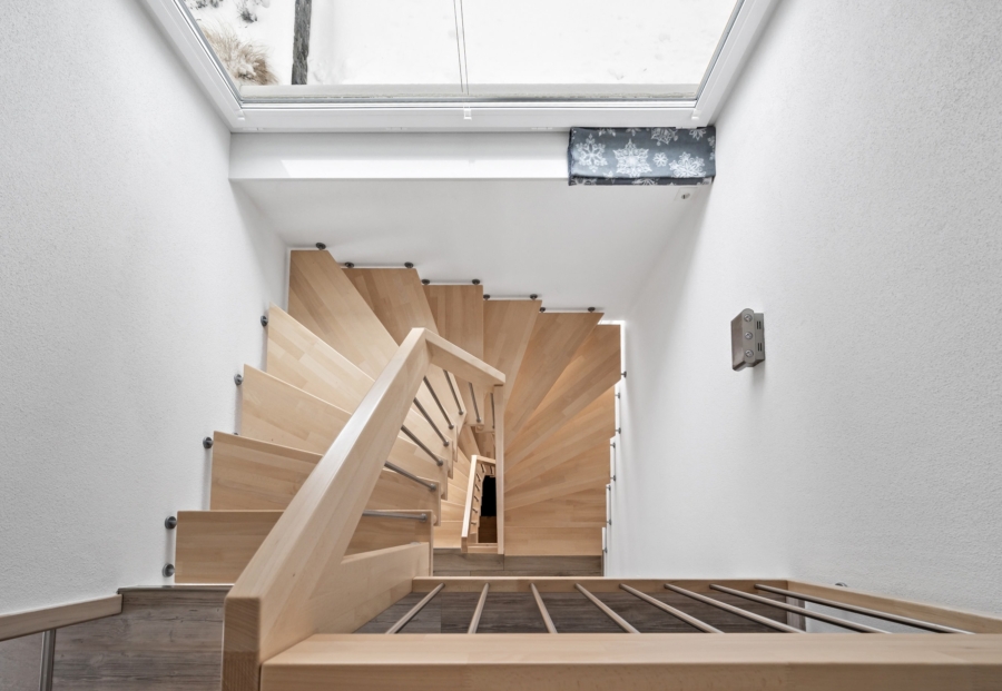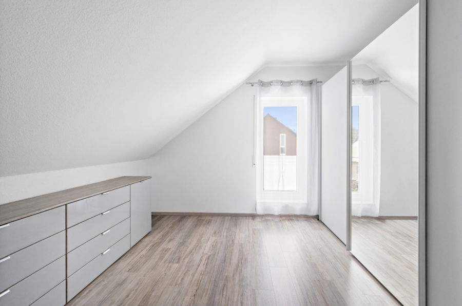 Über das offene Treppenhaus erreichen Sie das Dachgeschoss, welches über ein Zimmer, ein Schlafzimmer mit Ankleide und ein Bad verfügt.
