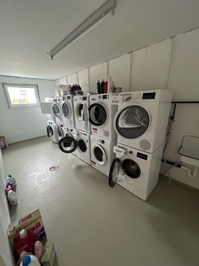 Die Waschmaschine und der Trockner finden in der gemeinschaftlichen Waschküche ihren Platz.