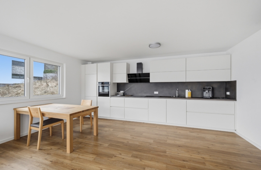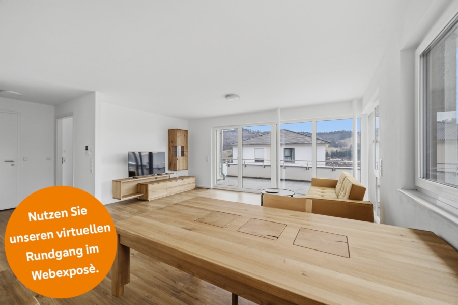 Es stehen ca. 93 m² Wohnfläche zur Verfügung, die sich auf einen Flur, welcher aller Räume miteinander verbindet, ein Bad mit WC, Badewanne und bodenebener Dusche, ein Kinderzimmer/Büro, ein Schlafzimmer sowie das große Wohn- und Esszimmer mit offener Küche, verteilen. Über das Wohn-/Esszimmer gelangen Sie auf die geräumige Sonnenterrasse mit Ausblick.