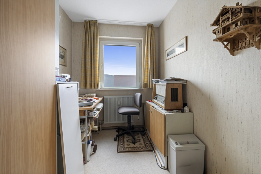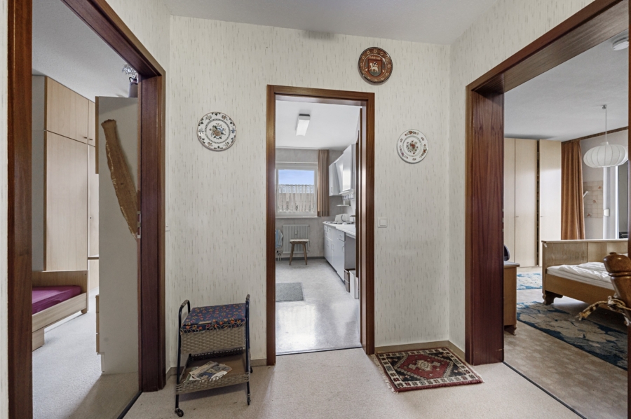 Auf ca. 86 m² verteilen sich ein helles Schlafzimmer und ein großes Wohnzimmer, jeweils mit Zugang zum Balkon. Ein geräumiger, zweckmäßiger Küchenraum mit kleinem Essplatz, eine Essdiele, ein geräumiger Abstell- und Garderobenraum, ein Kinderzimmer, ein Badezimmer sowie ein separates WC.