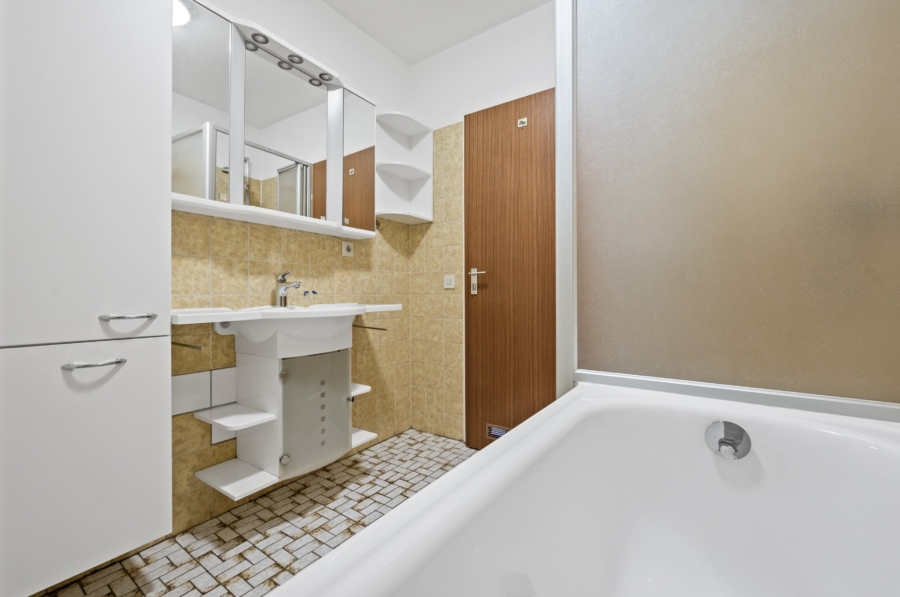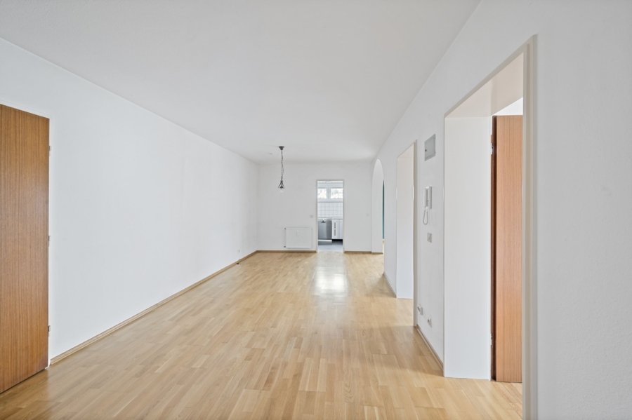Die Wohnung besteht aus zwei großen Schlafzimmer, einem Esszimmer mit Zugang zum Wohnzimmer und zur Küche, einem Bad und Gäste WC. Das Elternschlafzimmer und das Wohnzimmer verfügen über einen Balkon. Zur Wohnung gehört ein Kellerabteil und eine Garage.