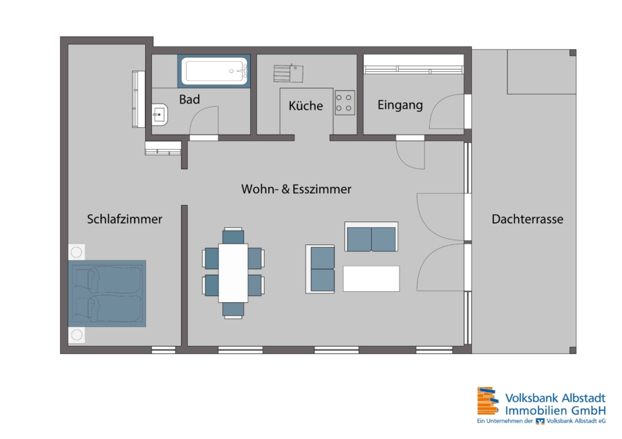 Auf ca. 50 m² Wohnfläche verteilen sich ein Schlafzimmer, ein helles Wohn- und Esszimmer und eine separate Küche, ein Bad mit Badewanne und der Eingangsbereich/Windfang.