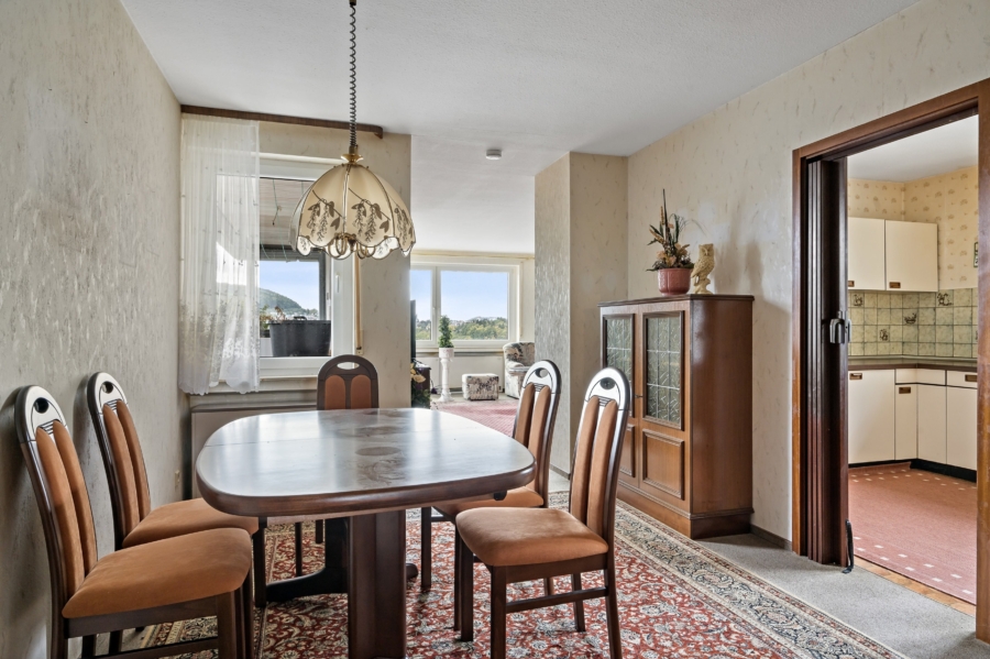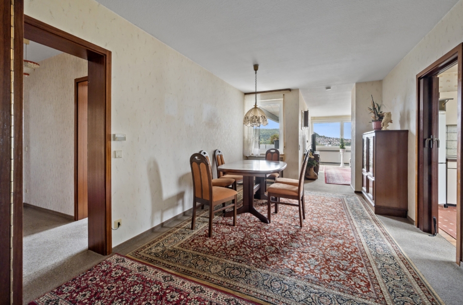 Über ca. 30–35 Stufen erreichen Sie die Wohnung, welche über einen eigenen Eingang verfügt. Im Eingangsbereich ist ein Windfang mit Zugang zum Gäste-WC.