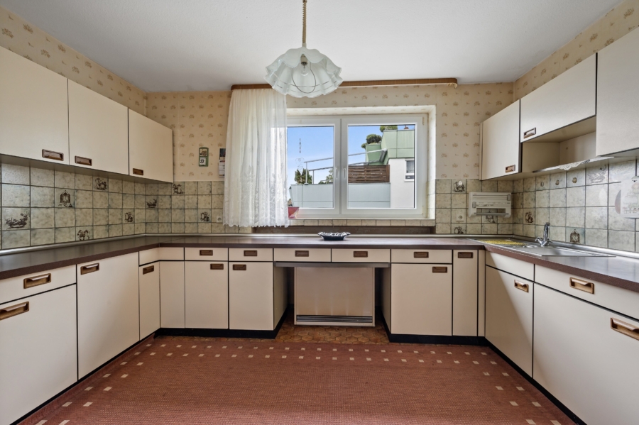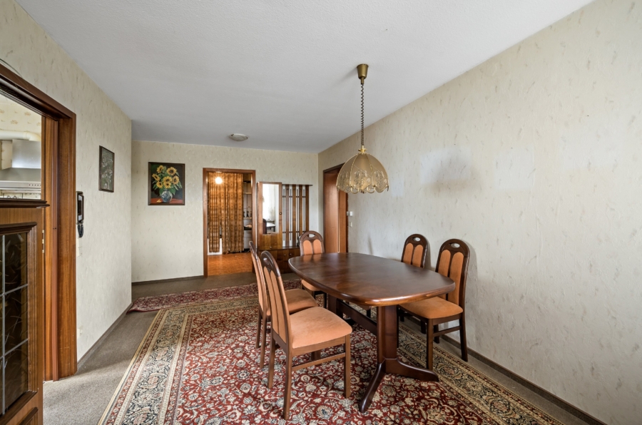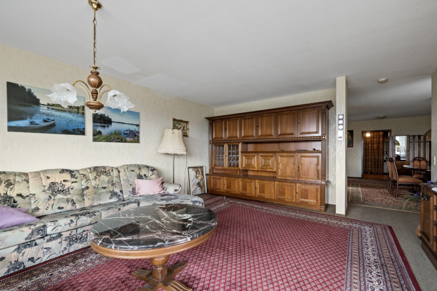 Dann gelangen Sie in eine Wohn- und Essdiele, welche den Zugang zum Technikraum (mit Waschmaschinenanschluss) ermöglicht, angrenzend in das große Wohnzimmer, und in die separate Küche.