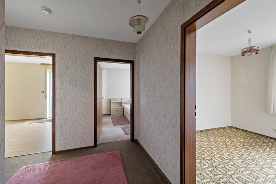 Auf die Diele folgt ein Flur, welcher Zugang zu drei Zimmer hat und dem Bad ermöglicht. Von einem der drei Zimmer ist ebenfalls die Terrasse zu erreichen.